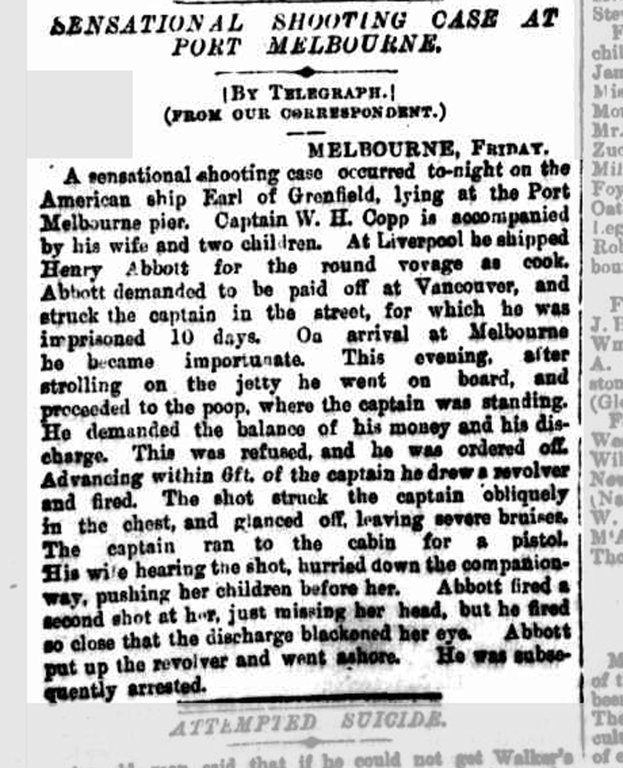One of the major real estate men who helped boost Grandview in the 1900s was Captain W.H. Copp who built a magnificent estate on Victoria Drive in 1905. An experienced sea captain, he had based himself in Vancouver before the city was even founded. In 1888, on a trip from Liverpool to Vancouver via Australia, he and his wife found themselves in deadly danger as this clipping from the Sydney Morning Herald on 29th December 1888 attests: