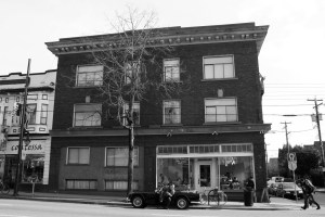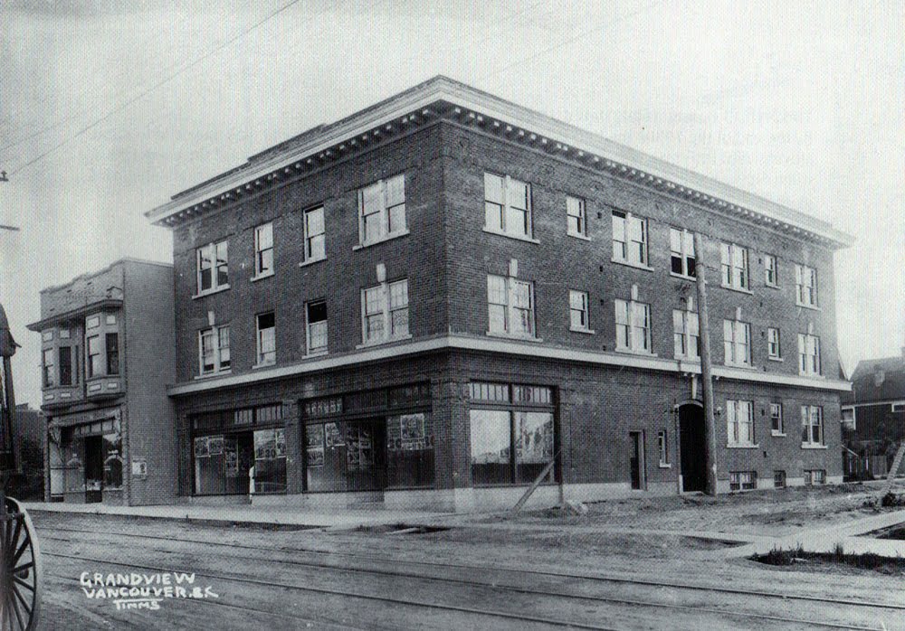 In August 1911, T.A. Allan and his brother received a building permit to erect a three-storey brick apartment building on the corner of Commercial & Fourth Avenue. In the previous two years, the Allan Brothers had erected large buildings at 1872 Barclay, 1460 Bute, 1860 Comox and 3216 E. First. By the spring of 1912, the building on Commercial, then known as the Allan Block, was ready for occupation.