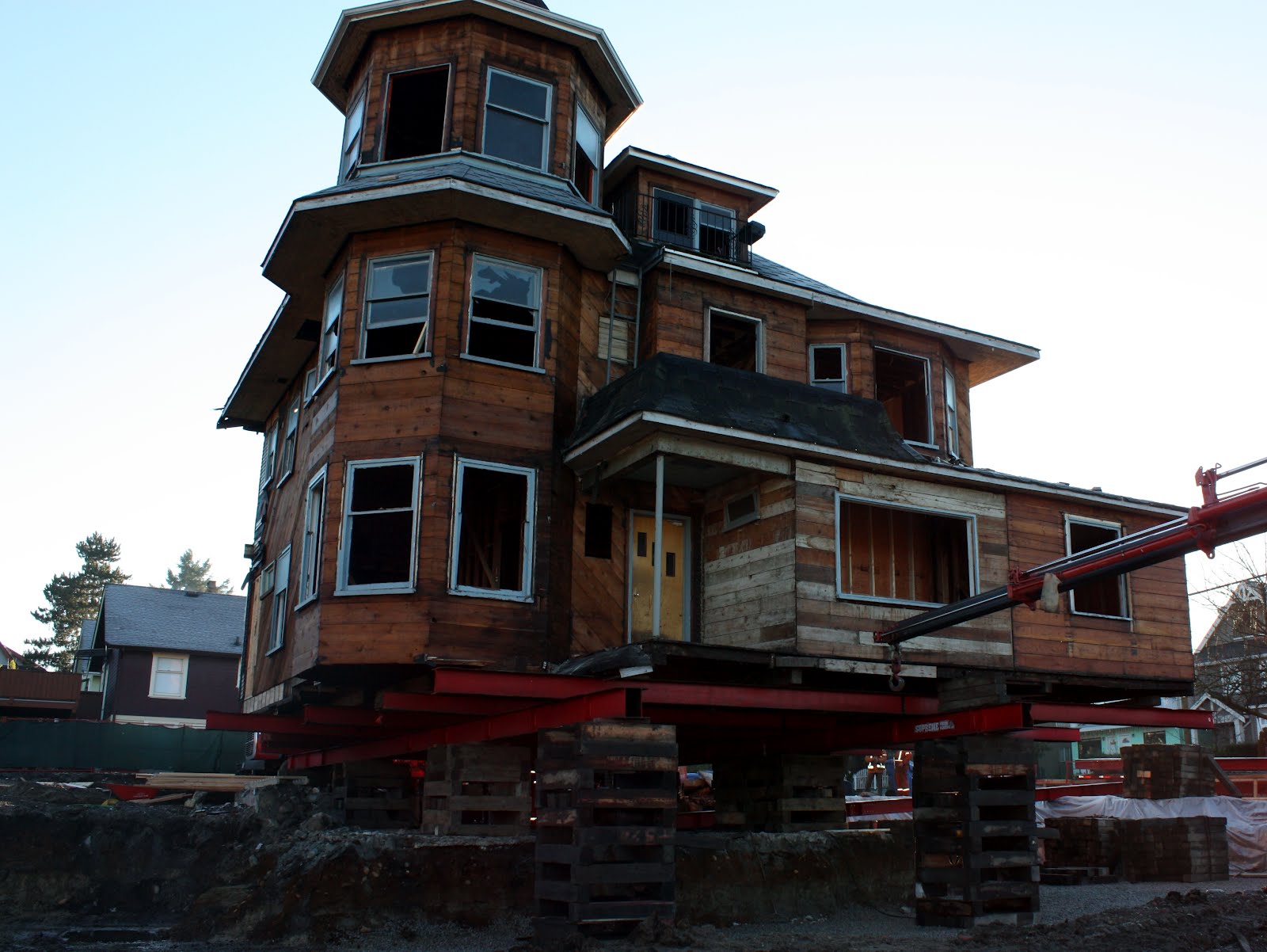… and ready to go. Here is the Jeffs House jacked up on rollers just before it was moved across the site at Charles & Salsbury.