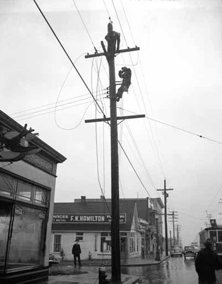 Today is the first day of Heritage Week. In BC, the theme is Power and Energy. In celebration, thereof, I offer this 1950 image of BC Electric workers fixing a power pole at Grant & Commercial (VPL 81076):
