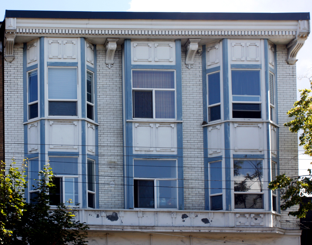 Unlike the flat brickwork of its neighbour, Rodway ordered up a building with bay windows and significant amounts of ornamentation. It is easy to believe that the pressed tin cornices, wall pieces and window parts were a deliberate advertisement for Joseph Rodway’s own business which eventually took over both storefronts.