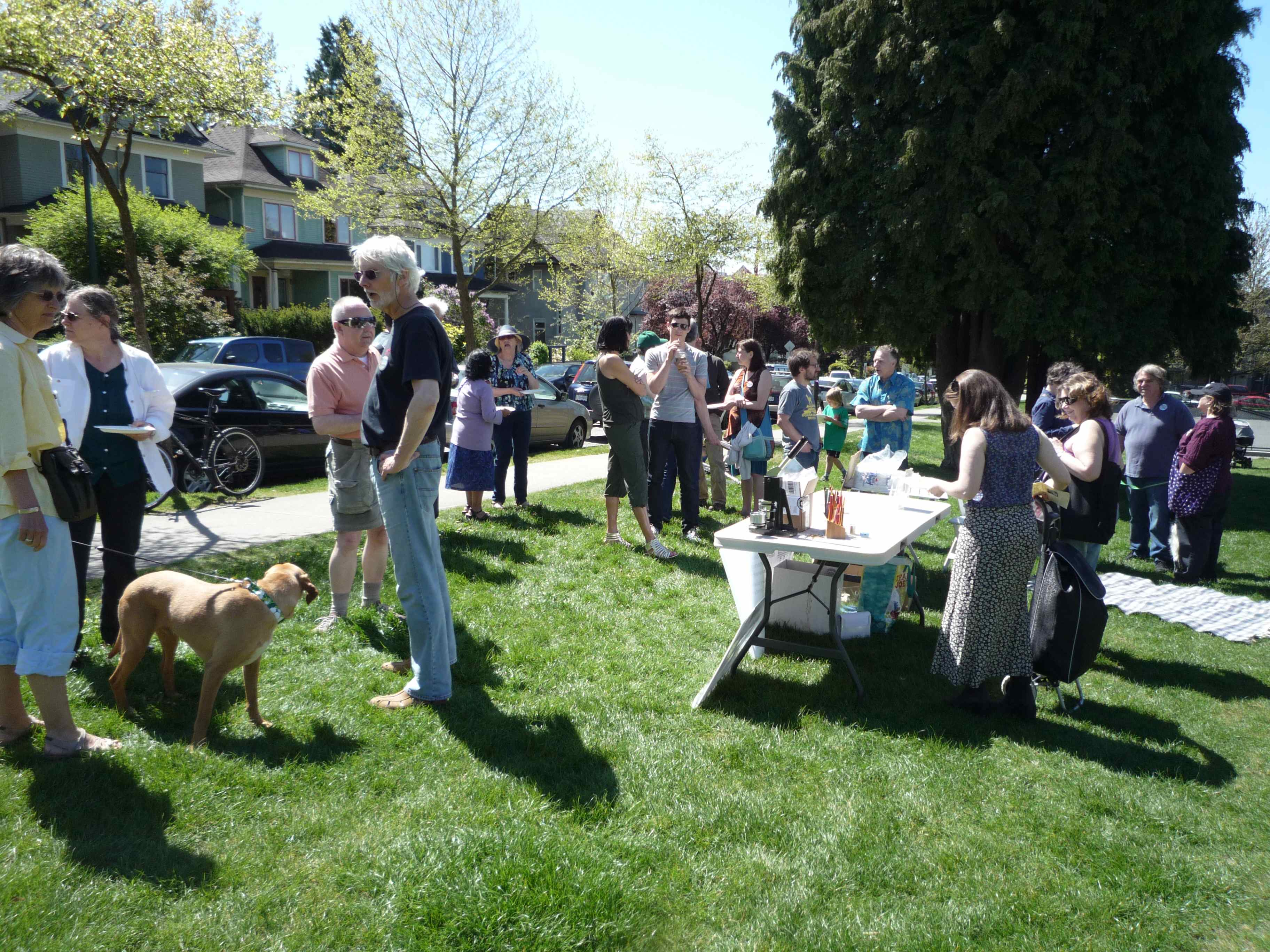 All the signs for our 2013 Centenary Campaign have been installed and we had a celebratory party in Grandview Park to acknowledge this year’s signs and the homeowners who agreed to have signs in their yards. The party was on May 4th, which, coincidentally, was also the second anniversary of our first Grandview Heritage Group meeting! Jak got a delicious cake from Fratelli’s and we had a few speeches and gave out some hand-coloured GHG pins — these will surely be collectors’ items some day! We have accomplished a lot in two years!