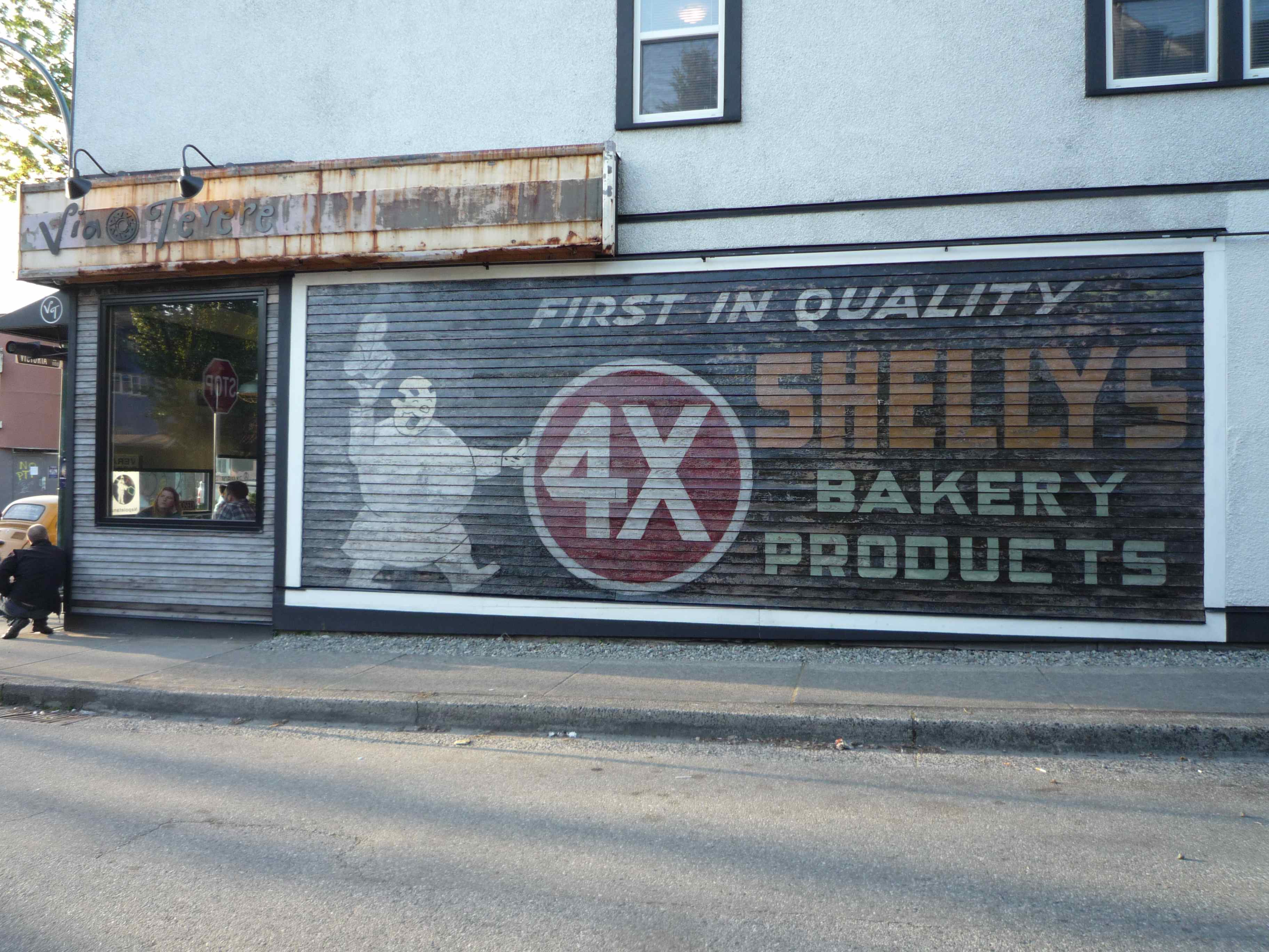 Michael Kluckner gave a report on the Shelly’s sign restoration project and also provided the group with a slide show about William Shelly and his Vancouver bakery empire. Via Tevere generously contributed $2000 to the sign project. Artists who worked on the sign were Victoria Oginski, our outdoor mural expert, Michael, and Penny. The idea was to revitalize and brighten up the sign, not to make it look new. Here’s the finished product: