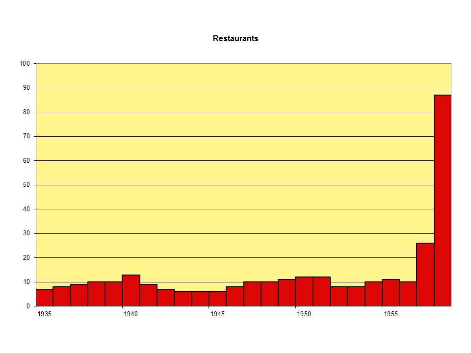 The graph below shows the number of eating places on the Drive between Venables and the Cut annually from 1935 to 1956. In addition, the last two columns show the number in 1982 and 2010.
