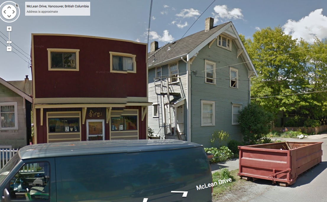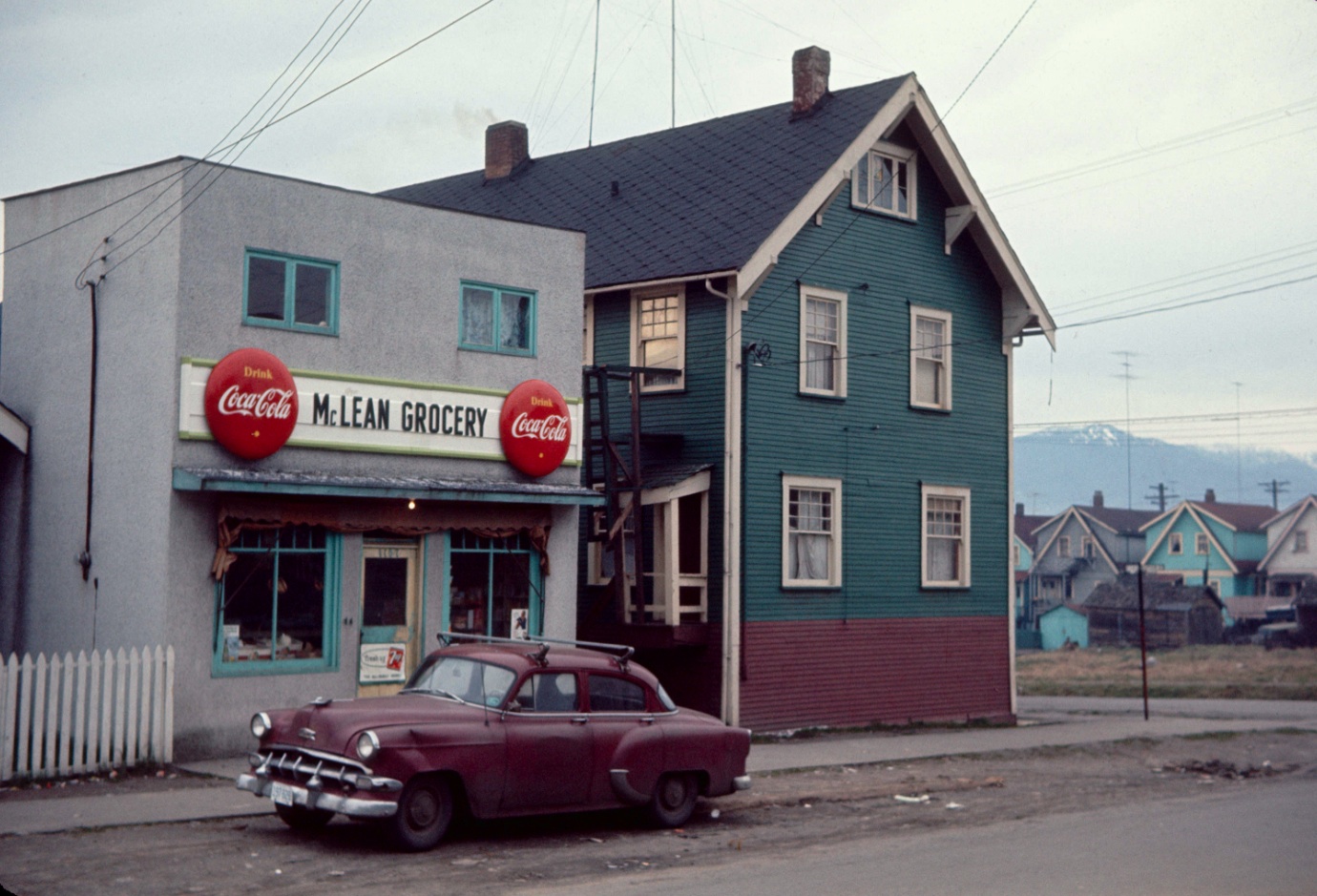 Grandview’s former grocery stores would make a fascinating subject for a research project and presentation. For example, here’s a 1960s-era city planning department photo from the City of Vancouver Archives of the McLean Grocery on McLean at Napier, showing how bleak and un-vegetated the area once was (so typical of the city’s old neighbhourhoods in that era).