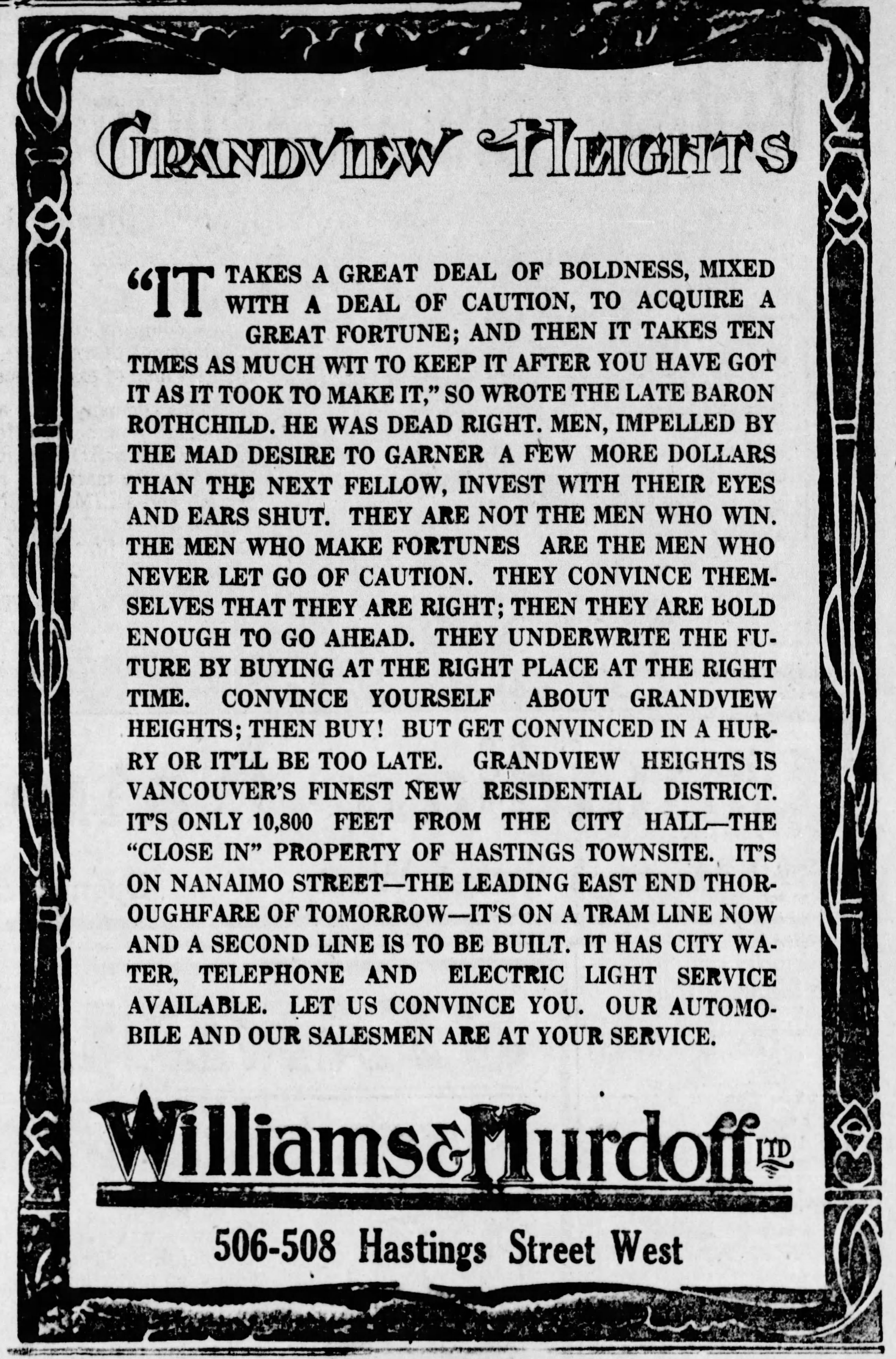 On this day in 1911, the real estate company of Williams & Murdoff Ltd posted the following ad in the Vancouver Daily World.