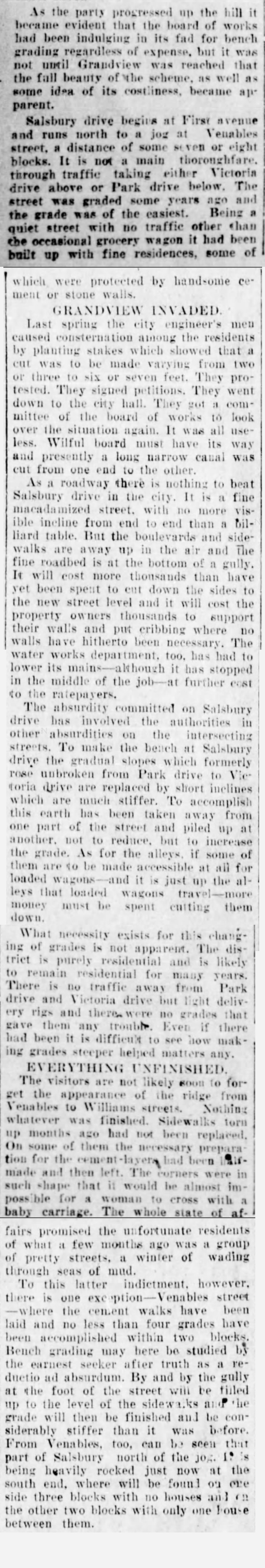 In September 1910, Mayor Louis D. Taylor and Aldermen Stevens and Enright toured the city “to see just what the [public] work was going on.” They began in Cedar Cove and then moved into Grandview. The following report, which gives a good description of some parts of Grandview at that time, is from the Vancouver World 24 September 1910 (page 18) and is headlined: “Terracing Fad Ruin Of Streets”: