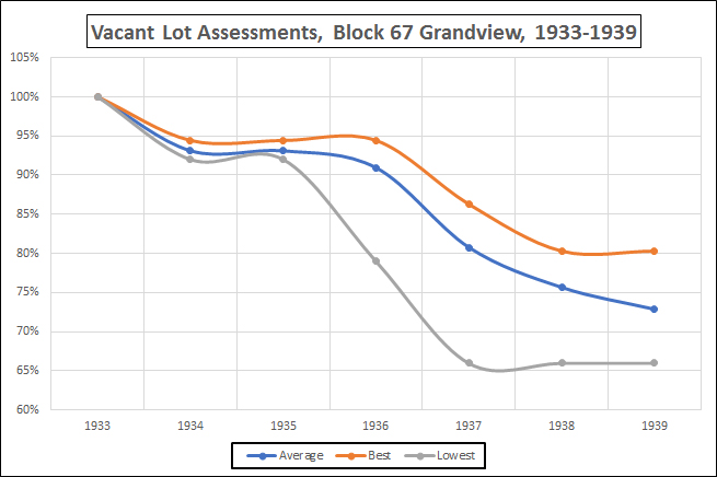 Using 1933 as the baseline (100%) value for the assessment, the following two charts show the fall in assessed values through 1939.