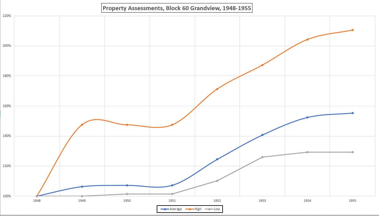 Using 1948 as the baseline (100%) value for the assessment, the following two charts show the rise in assessed values through 1955.