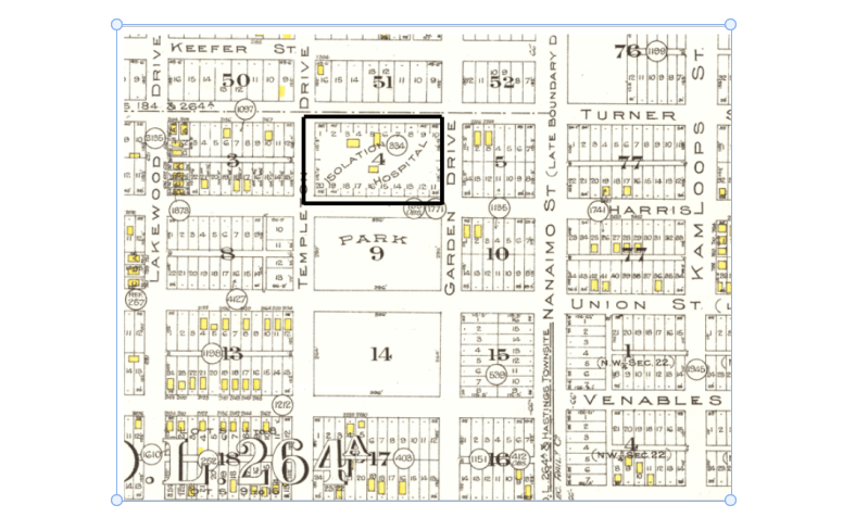 At a “hurriedly called meeting,” members of Vancouver City Council met on the evening of 8th July and a site for an isolation hospital agreed. At a later hearing, Ald. Anderson described the the meeting, The refusal of the Provincial government to offer a site, combined with the threat of an injunction if they put any more cases on Deadman’s Island, created an urgency as reported by the Vancouver Daily World a few months later: