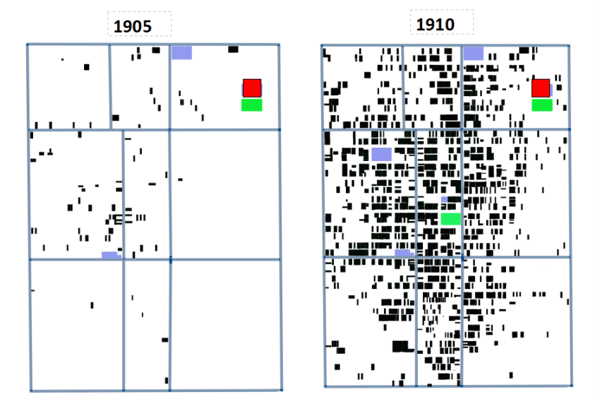 Change in building density in central Grandview 1905-1910. The red box is roughly where the Isolation Hospital stood