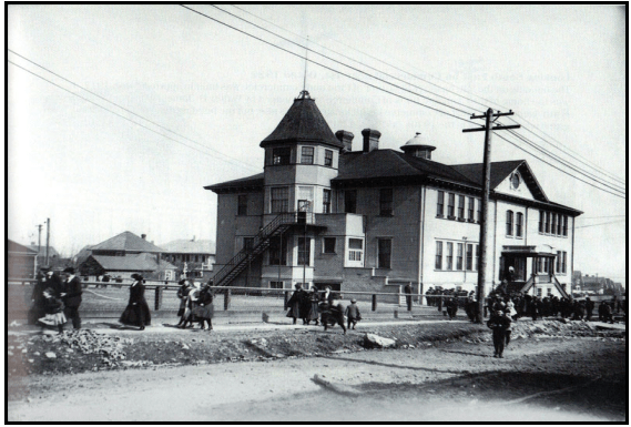 In June 1903, thinking well ahead of the developers and house builders, the Vancouver School Board quietly purchased lots 13-24 of Block 63 in Grandview. This comprised the southern half of the block bounded by First Avenue, Cotton Drive, Graveley Street, and Commercial Drive. By 1905 they had built and opened the Grandview School.i