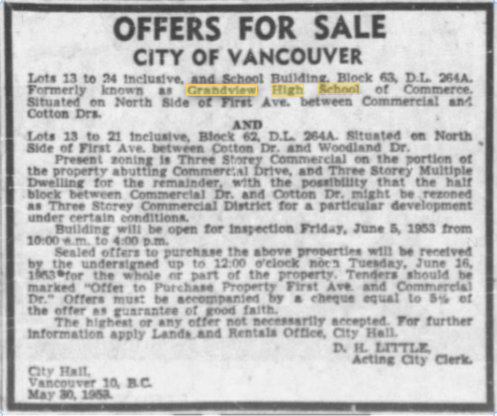 In April 1950, the Chamber of Commerce met with then Acting Mayor Birt Showler to discuss the general dismay Grandview felt over its treatment by City Council on any number of issues. During that meeting, Showler let slip that the problem for the Vancouver School Board regarding the First & Commercial site was the desire by some developers to take only the Commercial Drive frontage. He said, the VSB planners felt that if they let that part go, they would have trouble ever selling the rear section of the block. They were keen to find a buyer for the full site, he said.A month later, the chairman of the School Board’s building committee wrote to the Chamber admitting that the VSB “is quite unable to make up its mind whether to demolish the building and offer the whole property for sale, or whether to retain the building and offer only the frontage.” They were concerned, they wrote, that Britannia High School might become overcrowded and need an overflow building.vi
